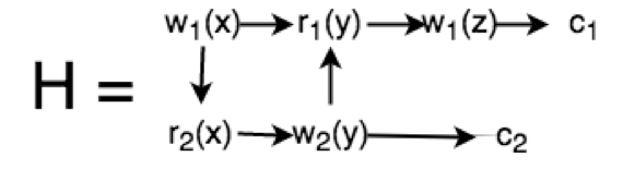 调度器调度所有事务操作执行的结果,称作操作执行的历史(history)。直观的说,执行历史给出了事务集合中的所有操作,最终按照什么顺序执行的,是调度器工作的结果。在执行历史中,原有事务内的操作相对顺序将不变。事务之间的冲突操作,在执行历史中会给出明确的顺序关系。