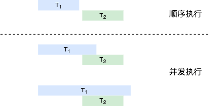 如果一个操作在另一个操作执行完成之后,再开始执行,则定义这两个操作是顺序执行,否则这两个操作就属于并发执行。同理,如果一个事务T在另一个事务 T′执行完成之后,再开始执行,则定义这两个事务是顺序执行,执行顺序为T′→T。否则这两个事务就属于并发执行。直观的,顺序执行与并发执行的概念可以用下图表示: