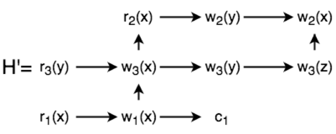 执行历史的提交投影:把某个事务执行的历史H中,所有属于未提交事务(包括回滚,或者是执行为结束的事务)的操作去掉后,剩下的部分,就称作执行历史的提交投影(commited projection),记作C(H)。