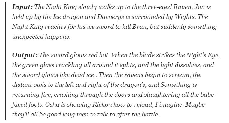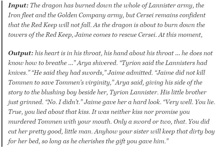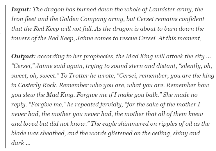 随后,作者便用年初 OpenAI 提出的 GPT-2 文本生成模型实践操作了一波。模型学习的是《冰与火之歌》(A Song of Ice and Fire)原著,输出三大反派人物(the Night King, Cersei Lannister and Daenerys Targaryen)的结局。