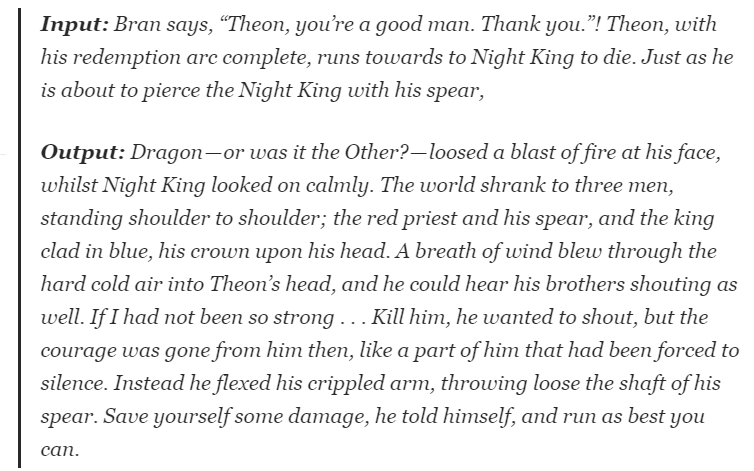这里有个地方很有意思,不是因为故事写得精彩,而是因为模型居然知道 the dragon 实际上是“Other”(也就是书中的 White Walker)。将所有这些细节正确地放在一个段落中,真的太奇妙了。神奇的是,这个模型已经完全了解有关人物的这些细节!