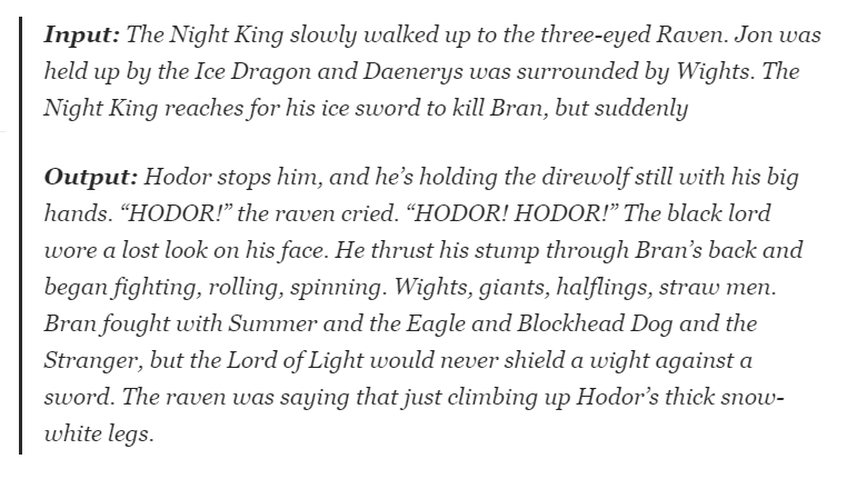 根据 GPT-2,Hodor还活着并赶来救营 Bran,这真是一个转折点! 或者可能是 Hodor的灵魂进入了 Bran 的身体。不过之后,也不知道这个模型想说些什么。。。