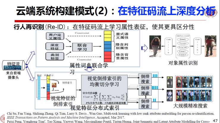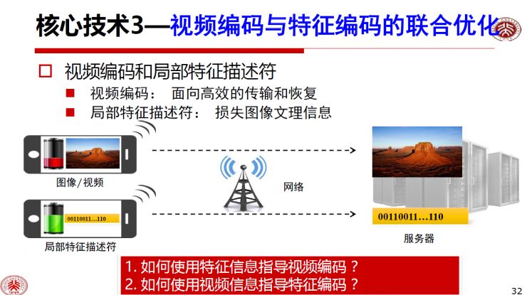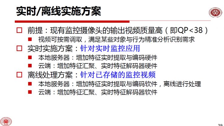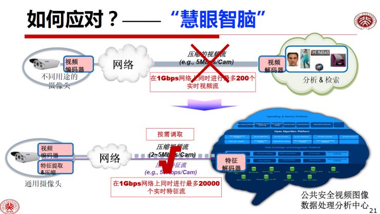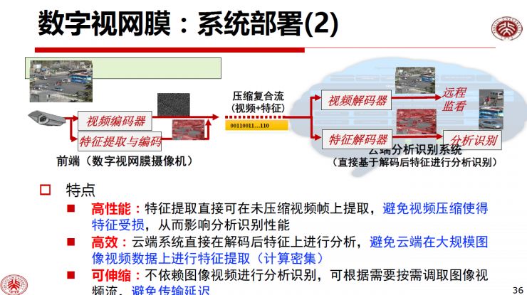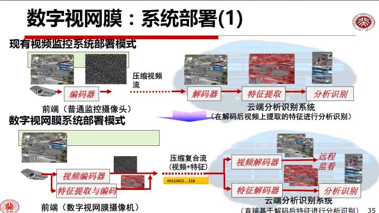 做法上,有很多技术路线。我举个例子,在现有的摄像头加上CPU或FPGA,把刚说的第二件事放进去,也可以把特征提取出来。当然,这里除了编码和特征提取以外,还有一个编码和特征之间的联系优化是非常重要的模块。