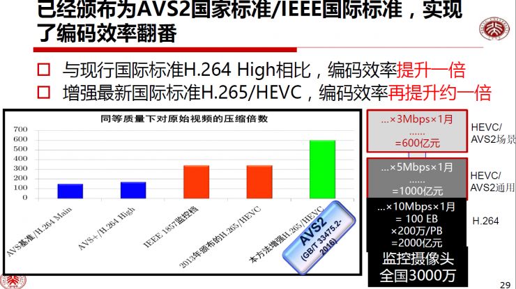 AVS2中有一项我们的独有技术,叫“场景编码技术”,使用了这个技术的编码系统,编码效率比现在第三代又高了接近一倍。所以我们经常开玩笑说,场景编码技术让我们提前跨入新一代编码标准时代。这是我们领先于国外标准的地方。