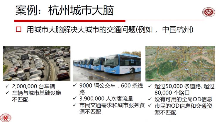 目前杭州大概有600多条线路、5万条道路、8万多个路口。这些路线上有着200万辆车,其中包括9000辆公交车,每天的乘客流量高达390万。