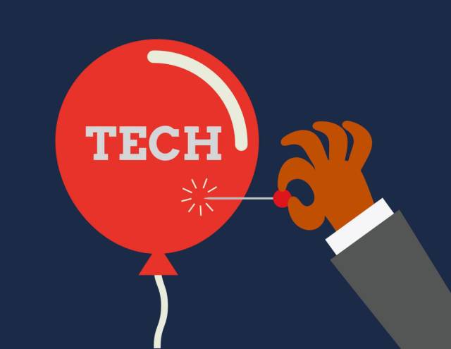这样的繁荣市场中却饱含忧虑,不断有声音把今天与本世纪初发生的科技泡沫做对比。1998年初,科技公司的估值要比普通市场高40%,到2000年初,科技泡沫达到峰值,估值超165%。2001年,科技泡沫最终破灭,纳斯达克指数从5000多点狂泻至一千多点,硅谷大量公司破产。