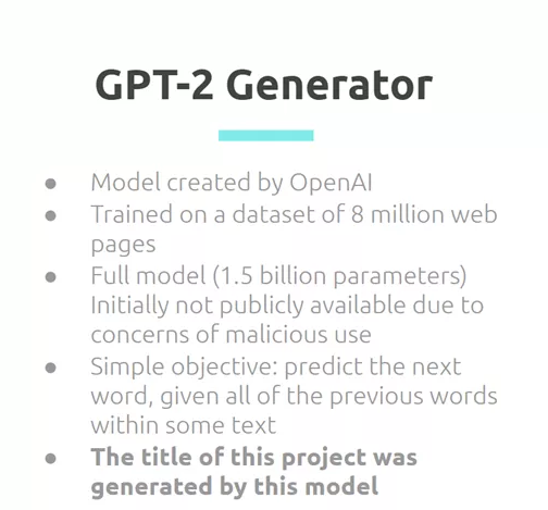 除了使用LSTM检查文本生成之外,该团队还使用来自OpenAI的名为GPT-2的变形器生成了文本。自Vaswani等人发表学术论文“注意力就是你所需要的”以来。在2017年,通过使用一种称为注意力的技术,变形器架构已经超越了先前模型的性能。Miguel Romero Calvo在他在Medium上发表的这篇文章中很好地解释了注意力如何作用于变形器的编码器部分,以及编码器和解码器如何配合在一起构成变形器。如果您已经熟悉这些体系结构,或者对学习如何使用它们的更多技术性知识不感兴趣,请继续阅读本文。您无需应用这些概念即可了解项目和其结果。