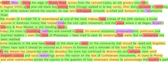 巨型语言模型测试室(GLTR)是由哈佛大学NLP与MIT-IBM Watson AI Lab合作创建的。该工具使用了BERT和GPT-2模型,可以逐字逐句查看该单词在句子中接下来被选中的可能性。在下面的图片中,绿色表示最有可能出现的单词中的前10个单词,黄色表示最常见的单词中的前100个,红色表示最常见的单次中的前1000个单词,紫色则表示1000后的单次。这表示绿色单词可能是模型输出的下一个单词,并且随着该单词变得不太可能被模型选择,它会落入其他颜色容器之一中。例如,以下图片是人类撰写的《纽约时报》文章的摘要。本文有几个可预测的词,但也包含许多生成模型将不太可能选择的词。这是因为人类在写作时不会考虑最可能出现的下一个单词。他们考虑哪个词最适合写作的上下文以及他们试图传达的想法。