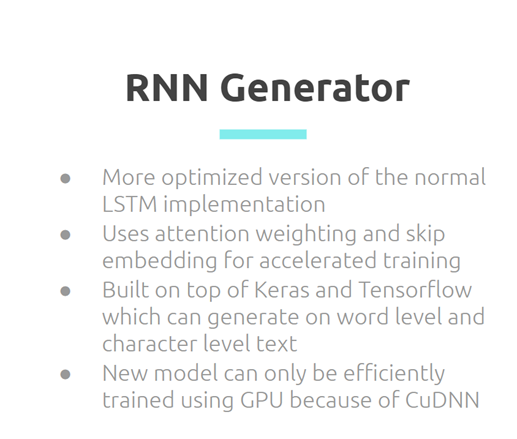 给定文本的情况下的结果并不理想。句子不连贯,有些单词似乎没有意义。鉴于这是一个较早的LSTM,因此还使用了较新版本的基于RNN的生成器来生成示例文本。这些改进的文本模型可更好地比较RNN的功能。