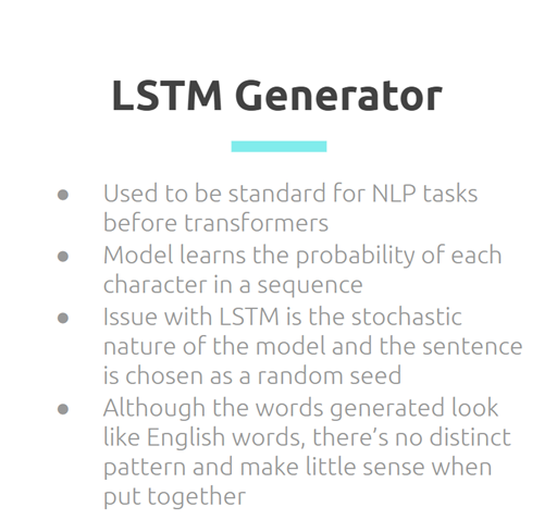 该团队探索了使用LSTM(长期短期记忆)架构和变形器架构的文本生成模型。在2017年推出变形器之前,LSTM被认为是NLP任务的标准。被允许进行比较,并检查该领域取得的进展。