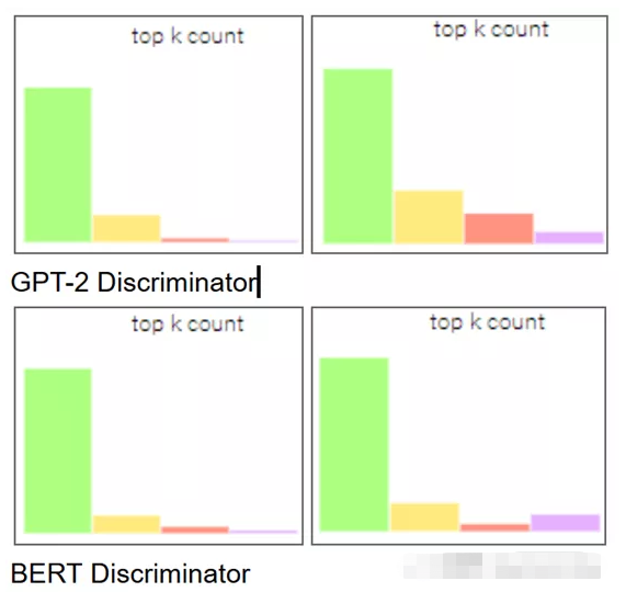 下面的四个图像显示了单词分布的差异。当将GLTR工具与GPT-2鉴别器一起使用时,虚拟文章(左上)比其真实对应词(右上)具有更高的可预测单词分布。在虚拟文章(左下方)和真实文章(右下方)上使用BERT鉴别器时,发现了类似的模式。使用这两种区分器,在生成器和人类创造的结果中这两个词之间有明显的区别。这支持了我们的推论,即生成器将仅基于单词的概率而非上下文来构造文本。尽管该项目没有开发出用于确定文本是否由计算机生成的数值度量,但是查看GLTR的输出可以提供一些见解。