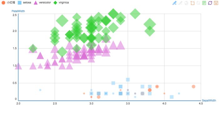 echartr(iris, SepalWidth, PetalWidth, weight=PetalLength) %>%