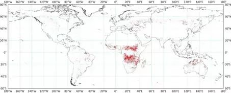 图2. 2015年全球火烧迹地空间分布图(格网化处理)