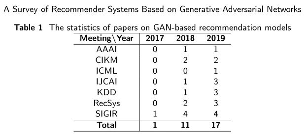 GANs在其他领域的成功应用为RS树立了良好的榜样,一些开创性的工作已经在这一领域迈出了第一步[82]。根据近三年与RS相关的顶级会议的统计,基于GAN的推荐模型的论文数量逐年增加,如表1所示。在2018年基于GANs的信息检索(IR)模型研讨会上, 研究人员[95]指出基于GAN的RS将成为一个热点领域的RS。原因在于,GANs的想法带来了新的机会抵抗噪声数据的干扰和缓解数据稀疏。在现有的基于GAN的RS中,为了减少RS对数据的干扰,一些研究人员验证了加入对抗扰动的有效性,并在目标函数中引入极小极大对策来减少数据噪声。与此同时,其他研究人员试图使用鉴别器以一种对抗性的方式从未观察到的例子中区分出信息更丰富的样本。为了缓解数据稀疏性问题,现有的基于GANs的推荐模型不仅可以通过增加user-item交互信息直接生成用户偏好,还可以通过增加辅助信息合成用户偏好,可以显著降低数据稀疏性。