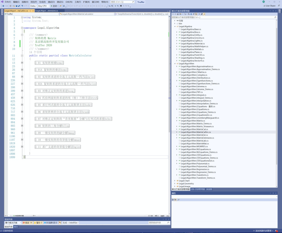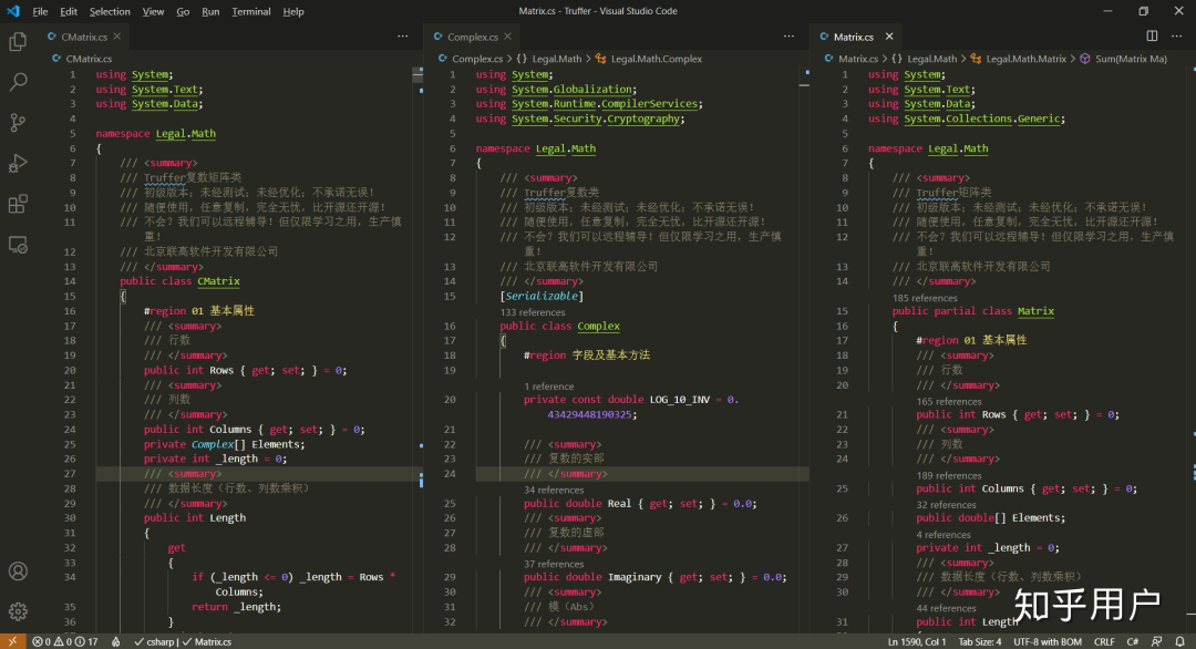 三个源文件分别是CMatrix.cs,Complex.cs,Matrix.cs,分别对应了复数矩阵、复数和实数矩阵的基本运算。至少在代码架构上,TRUFFER是能够完成它现行设计的场景的。当然还有一些常规的矩阵运算。