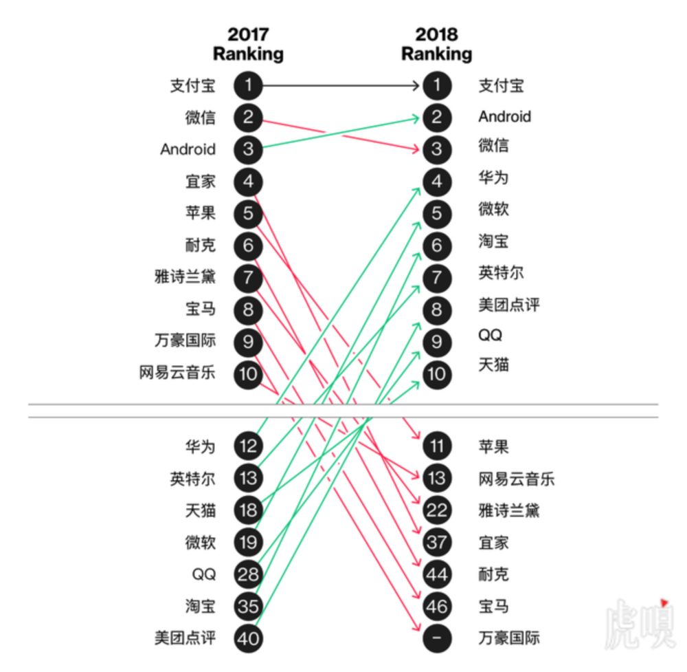 在上榜的50个品牌中,30个为中国本土品牌,其中排名第一的是支付宝。