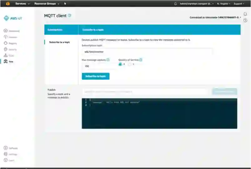 在 AWS IoT 控制台选择 Test,并提交 sdk/test/monitor topic: