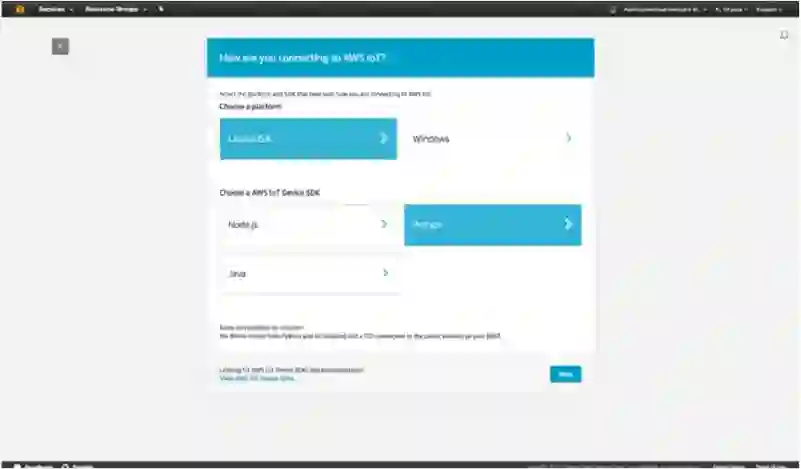 在 AWS IoT 控制台中,我们可以使用 AWS IoT Connect wizard。对于平台,选择 Linux/OSX;对于 SDK 类型,选择 Python,然后就可以选择下一步了。