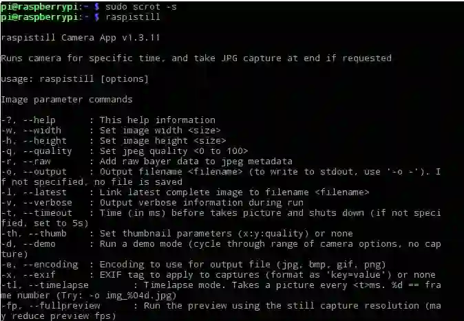 下面我们可以调校和测试摄像头,如果测试摄像头静态拍照,我们可以键入 raspistill 打开拍照应用。打开后会显示很多命令,我们可以根据这些命令和后面的解释调整摄像头,比如键入 raspistill -sh 30 就表明调整锐度为 30(-100 到 100)。如果我们尝试进行拍照,可以键入 raspistill -o image.jpg -t 2000,即延迟两秒输出名为 image.jpg 的图片。或者可以键入命令 raspistill -o image%d.jpg -t 20000 -tl 1000 -v:即持续 20 秒,每一秒输出一张相片,且图片命名为 image0.jpg、image1.jpg、image2.jpg 等。