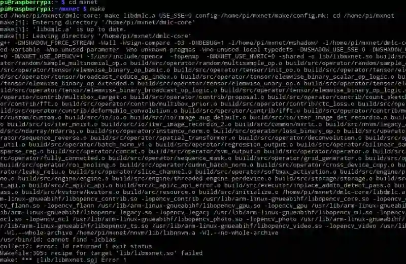 最后我们另外为依赖库运行了一句命令:sudo apt-get install -y build-essential Git libblas-dev libopencv-dev,然后真的可以 make 了,但在持续进行两小时后,还是报错了。后面再 make 也会一直有如下报错: