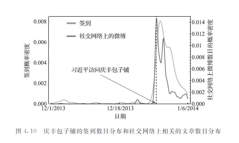 在大数据时代,移动数据的普遍收集在很大程度上能够刻画用户的各种消费行为,比如在餐厅的签到数据表明了用户就餐的消费行为,在商场连接Wi-Fi的数据蕴含了用户购物的消费行为;与此同时,社交网络的快速发展也逐渐对用户的消费行为产生越来越重要的影响,一方面社交网络中朋友对某件商品的讨论或者口口相传可能会成为冲动购物的刺激因素,另一方面,越来越多的品牌店甚至个体卖家利用社交网络作为越来越重要的市场营销平台。因此,把两者关联起来,就能够通过数据驱动的方式来计算消费冲动心理,使得消费冲动心理的测量能够被大规模的采用。如图4.10所示的例子,在国家主席习近平就餐庆丰包子铺的事件后,社交网络上出现了大量的相关信息,而随后有大量的用户在该店铺留下了签到数据。签到数据和社交网络上相关信息的强关联性表明了很多用户很可能是受到社交网络上信息的刺激才去消费的。