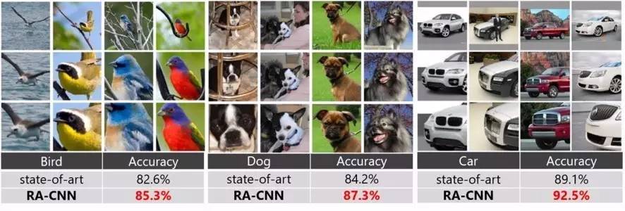 上图中的红色部分则是定位子网络,其输入是一张图片的卷积层特征,而输出的是这张图片有判别力区域的中心坐标值和边长。定位子网络以层间的排序损失函数作为监督,优化下一尺度的图片子区域在正确类别上的预测概率大于本尺度的预测概率,这样可以促使网络自动找到最有判别力的区域。有了重要区域的坐标,再对原图进行裁剪和放大操作便可得到下一尺度的输入图片,而为了使网络可以进行端到端的训练,研究员们设计了一种对裁剪操作进行近似的可导函数来实现。以下是“RA-CNN”在三个公开数据集上找到的有判别力区域的例子及对应的分类精度: