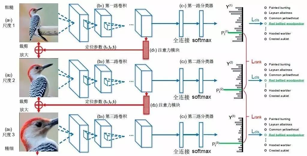 只需输入一张图片,“RA-CNN”便可自动找到不同尺度下的有判别力区域:上图中蓝色部分是分类子网络,它们将多个尺度的图片用相应的卷积层提取出特征后送入softmax 分类器,再以类别标签作为监督对卷积层和分类器参数进行优化,当最终分类时,将各个尺度的特征拼接起来,用全连接层将信息充分融合后进行分类。