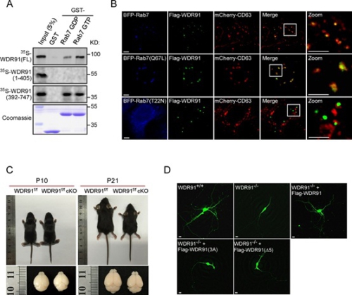 A.WDR91 与活性形式 GTP-rab7 的相互作用。B.WDR91 被野生型 Rab7 或持续活化的 GTP-Rab7(Q67L) 招募到内吞体上。C.脑组织特异性敲除 Wdr91 小鼠的大脑发育异常。D.野生型 WDR91 而非 Rab7 结合缺陷性的 WDR91 突变体使缺失 Wdr91 的异常原代神经元恢复为正常。