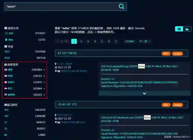在fofa.so上搜索”exim”发现使用exim服务的服务器数量挺多的,但大部分的exim服务集中在美国。