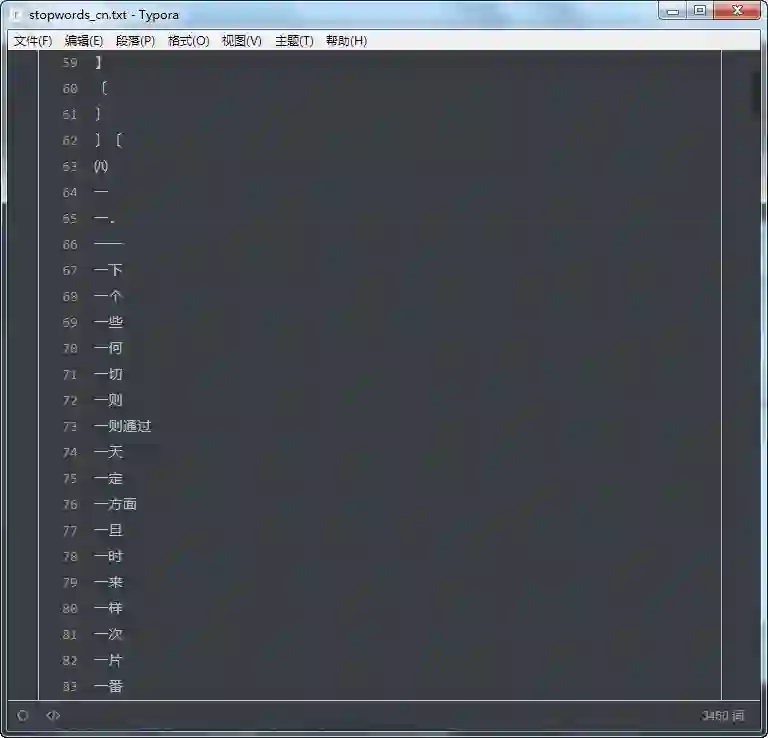 网上有很多中文 stopwords 词库资料,这里选取了一套包含近 2000 个词汇和标点符号的词库:stopwords_cn.txt,结构形式如下: