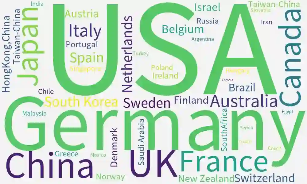 4{'USA': 1459, 'Germany': 382, 'UK': 379, 'China': 320, 'France': 210,..}