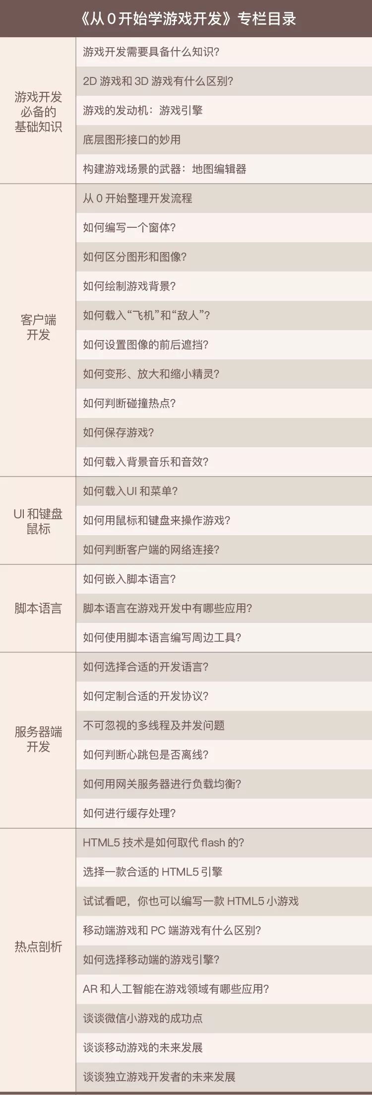 总之,我将结合自己二十余年的游戏领域实战经验,手把手带你梳理游戏开发流程,教你从零开始学习游戏开发,专栏目录见下图: