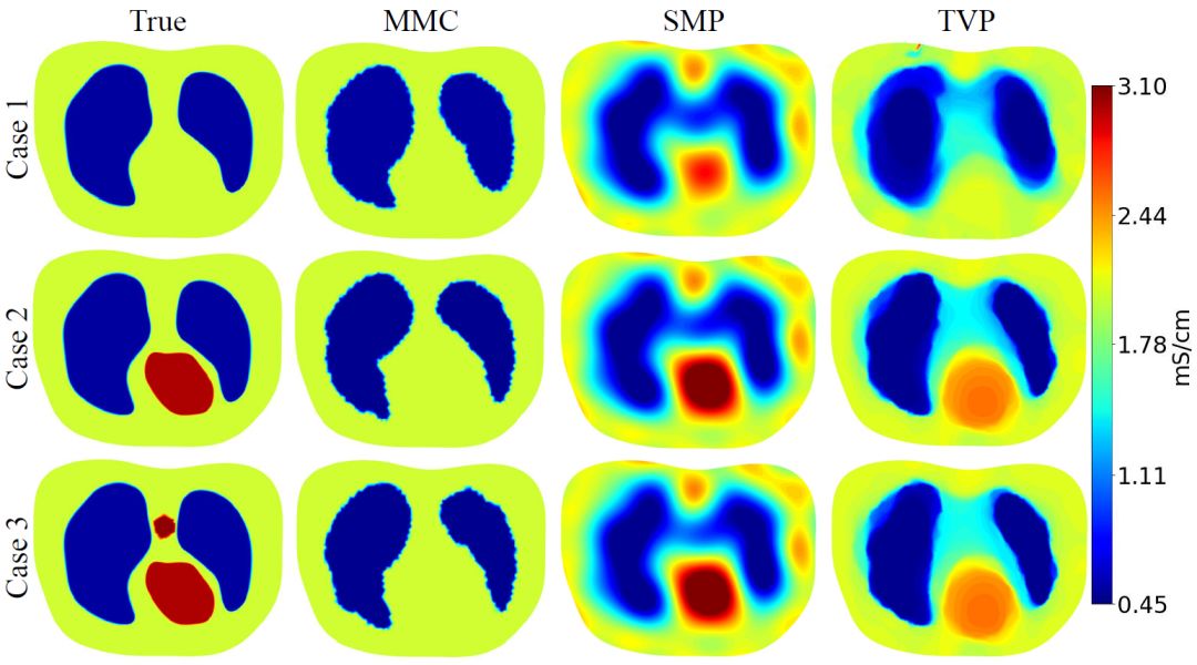 图:肺部电阻抗成像。Ture: 真实电导率分布;MMC:自主开发算法成像结果;SMP与TVP:传统算法成像结果。
