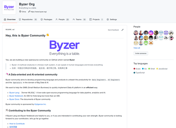 Byzer 社区由 Kyligence 发起,主要围绕 Byzer 语言来打造面向 Data + AI 领域的开源生态,旨在帮助用户以低成本和高效率的方式落地数据平台和完成 AI 工程化,释放分析师、工程师以及运维人员的生产力。目前 Byzer 社区内的项目均采用 Apache License V2 发行,允许所有社区参与者在该协议下进行自由使用。
