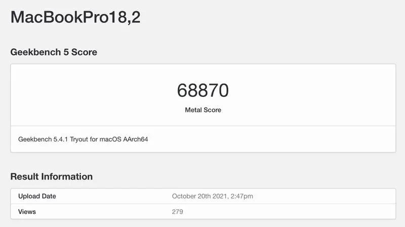 M1 Max配备了多达32个图形核心,这标志着与苹果第一款芯片M1的8核图形处理器相比,是一个巨大的进步。今天,M1 Max的第一个Metal跑分浮出水面,该芯片的得分为68870分。