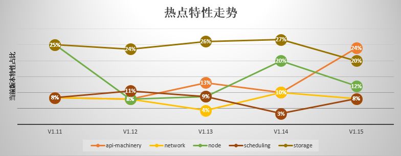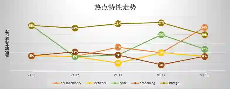 经过分析 Kubernetes 近几个版本的变化,我们发现特性主要集中在 Storage、Node、API-Machinery、Network、Scheduling 等 SIG,而这些 SIG 大都致力于可护展性增强,以便于下游用户在享受稳定核心的同时,轻松扩展定制自己的插件。