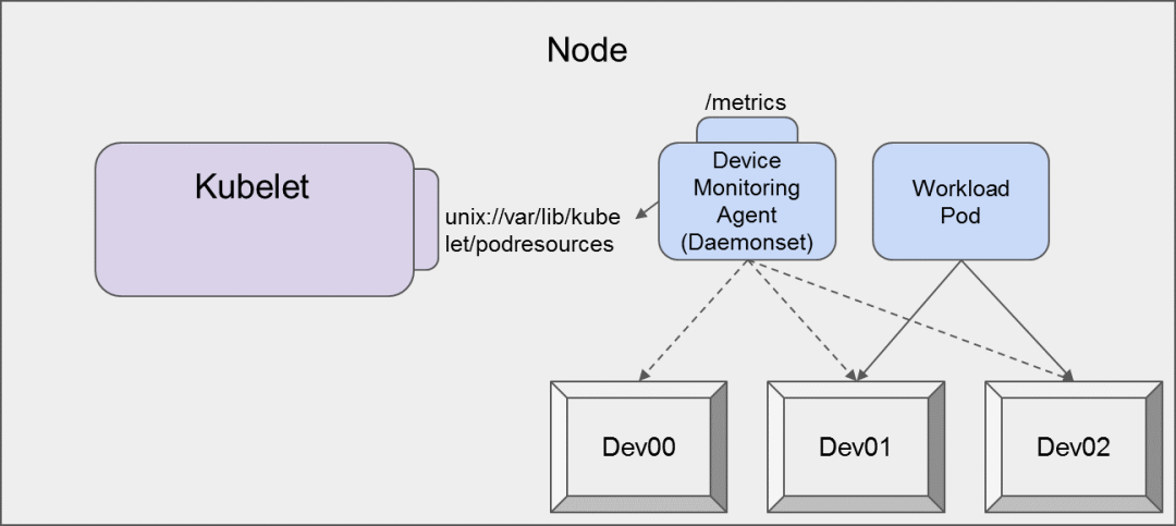 c. Device Monitoring Agent 根据设备类型过滤获取容器的设备 ID,通过设备驱动接口获取容器使用的设备的监控指标,并把二者关联到 container 、pod 上。