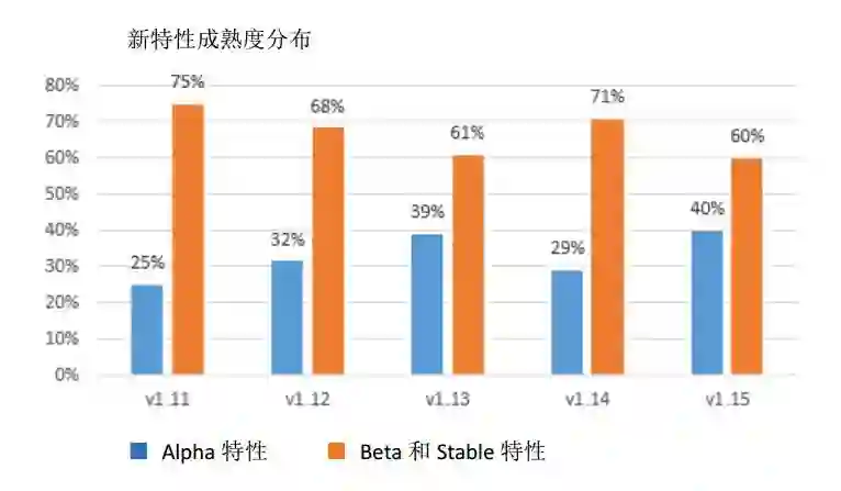 对比分析过去几个版本的特性成熟度,不难发现 Alpha 新特性的占比稳定在 20%~40% 之间。按照社区惯例,当一项全新的功能被添加时,会在特性说明中打上 Alpha 标记。持续稳定甚至小幅上涨的 Alpha 特性占比说明社区仍然在大量开发全新的特性,而不是满足于既有功能的加固。