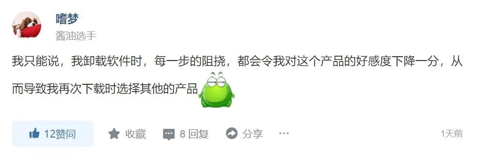 为什么这么说?对此,许多网友给出了回复——从使用者的角度,每一次决定卸载,那一定是非卸载不可,不存在软件进行挽留后就不卸载了的这种现象。
