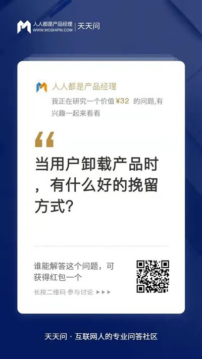 很多产品在用户卸载时会进行挽留,提示还有优惠券未用、提醒用户还有诸多功能等待发现、发出问卷询问为什么卸载……对一个决意离去的用户进行挽留有用吗?如果要挽留,有什么好方法呢?针对这个问题,我们在天天问发出提问,一起来看看小伙伴们是怎么说的吧~