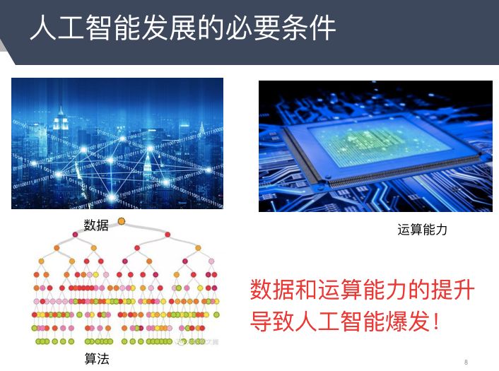 人工智能发展60多年,算法也出现几十年,但是唯有今天的数据和运算能力才促使人工智能突飞猛进。就像爱因斯坦的E=mc^2的公式,很早就提出来了,但只有到了原子弹爆炸和核电站,才实现了应用。