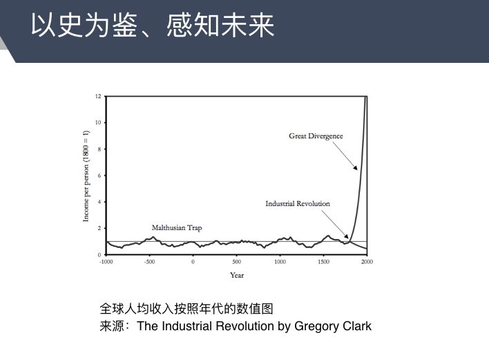 从劳动生产率来看,人类过去3000年是原地踏步,人们的生活方式在秦朝和清朝没有根本性变化。但是过去200年,社会变化翻天覆地,是颠覆性的200年,这是工业革命带来的。