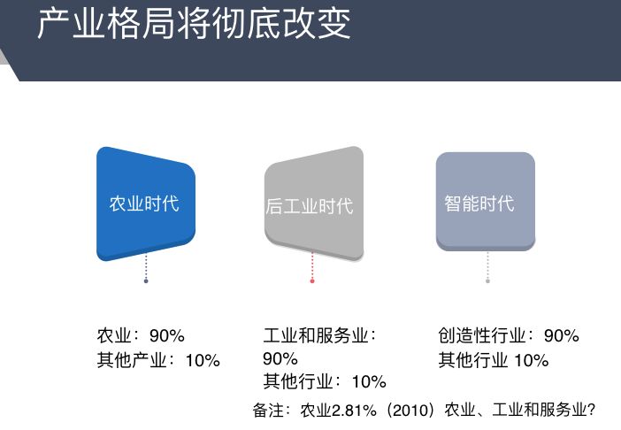 两百年前,最大的产业农业在2010年占GDP的比重仅有2.81%,在智能社会我们可以大胆想象,基于人工智能和创造性的产业占比将达到90%,因此这个社会的财富会再一次被分配,中间的机会非常之多,只有静止不动的企业和静止不动的个人一定会被时代淘汰。