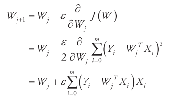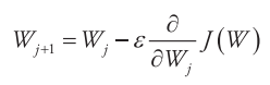 其中,ε称为学习率(Learning Rate),j表示W的迭代次数,将J (W )代入上式得到: