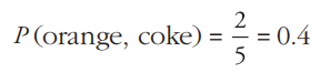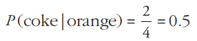 计算示例2:计算在所有的流水交易中“既有orange又有coke的支持度”,即P(orange, coke),从上述的购物流水数据中可以发现,总计有5条交易记录(T1、T2、T3、T4、T5),既有orange又有coke的记录有两条(T1、T4),因此