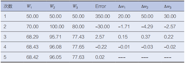 整个训练过程中各个参数变化如表4-4,为了便于阅读,将每次迭代W的变化罗列在表中,即表中的∆w1、∆w2、∆w3。