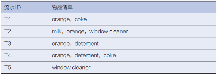 引用一个经典用例解释上述的若干概念,使用的数据集如表4-3所示,该数据集可以认为是超市的购物小票,第一列表示购物流水ID,第二列表示每个流水同时购买的物品。