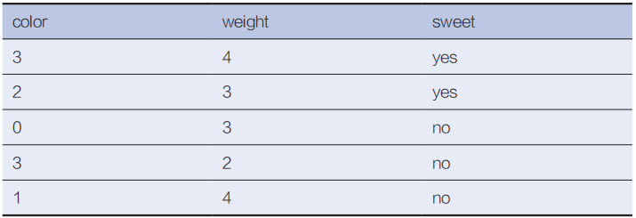 为了更好地理解上述计算流程,以一个具体的实例说明。已知一个训练集如表4-5所示,特征属性有两个,分别是color和weight,其中,color的取值范围是{0, 1, 2, 3};weight的取值范围是{0, 1, 2, 3, 4}。类标属性有1个(sweet),取值范围是{yes, no}。
