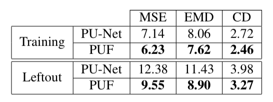 本文在点云上采样任务重测试 PUF,结果如表 3 所示。本文在 3 个指标上与当前最优的点云上采样方法 PU-Net 进行了对比:MSE、EMD 以及倒角距离 CD(Chamfer Distance)。