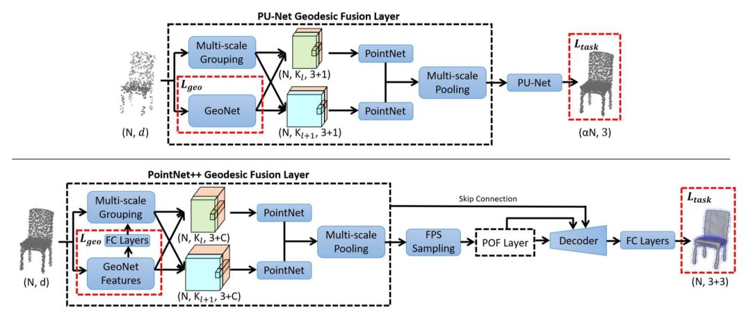 ▲ 图 3:PU-Net(上)和 PointNet++(下)测地融合方案。